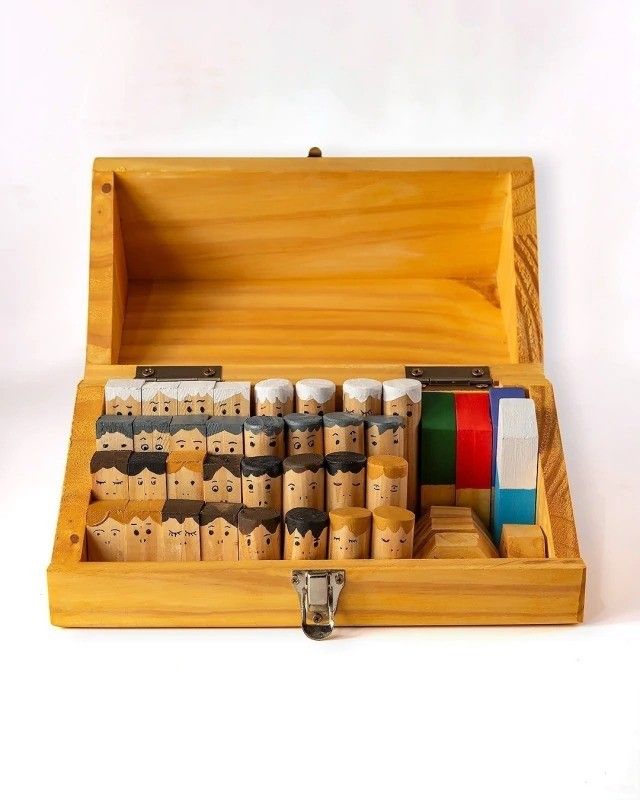 Este maletín de madera contiene un juego de víncores con las 4 generaciones+ piezas impersonales+ piezas para no nacidos preparado para el trabajo con Constelaciones Individuales.